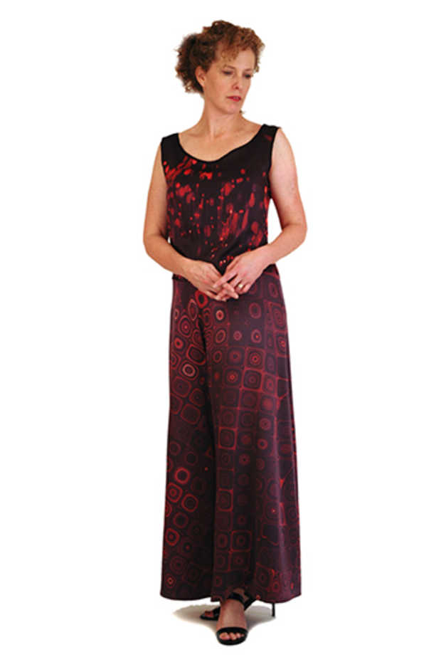Fluid Palazzo pants with wide, flowing legs, left side zip & elastic at waist. Outside leg approximately 38", hem approximately 40". Silk Charmeuse. Santorini, one of the most popular Greek islands, is an idyllic place, known for its legendary beauty and magic. Its breathtaking sunset, colorful volcanic sandy beaches and the brown-reddish cliff, were the inspiration of this exquisite design.