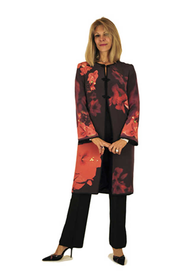 Long jacket, back length about 42 in, trumpet sleeves, round neckline. Lined in Four ply silk. Flowers and romance are inseparable. Ever since the ancient Egyptians used flowers as symbols of love, flowers have come to symbolize romance, passion and desire.