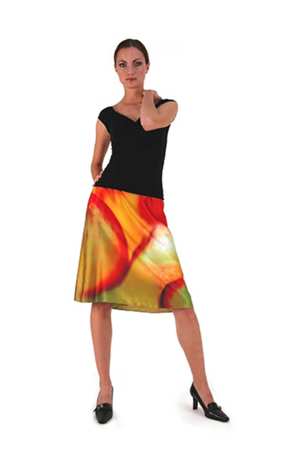 Slightly flared short skirt, left side zipper, no waist band, lined. Skirt length approximately 23". Silk Charmeuse. It is said that the gods and goddesses of Mount Olympus were bloodless, for they neither eat bread nor drink wine. Their only food and drink were nectar and ambrosia, thought to confer immortality. With its exotic feel, this skirt captures and communicates that same energy of the pantheon. Vibrant and radiant, Ambrosia skirt is a flavorfull choice for a sweet, sultry look.