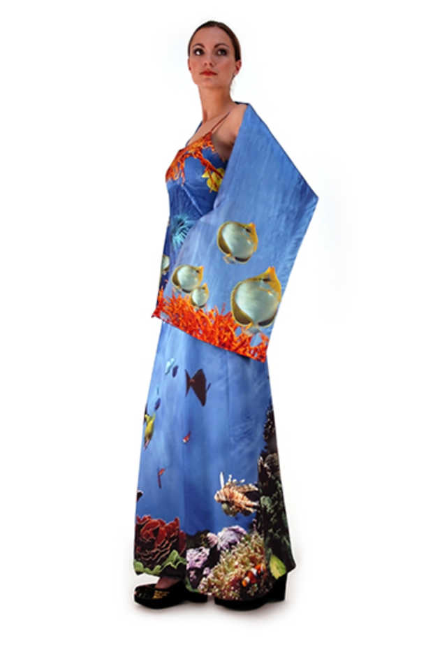 Sleek Empire line dress, spaghetti straps, cami neckline, back zipper, floor length, slightly flared hem, lined. Length from waist approximately 41". Silk Charmeuse. Signature, original art by Digital CoutureĀ®, seamlessly hand printed on silk. Amphitrite herself, wife of Poseidon the supreme ruler of watery depths, would be jealous of the beauty contained in the sea vignette captured in this gown. With classic elegance and refreshing style, this dress displays the oceans hidden beauties while inviting you to discover those of your soul.
