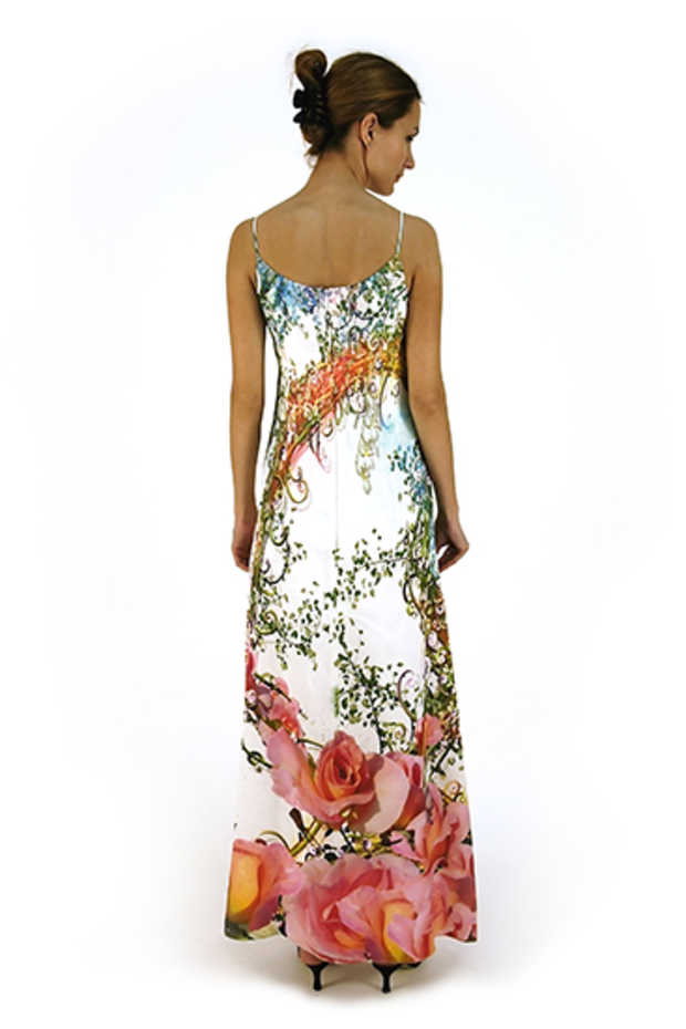 Sleek Empire line dress, spaghetti straps, cami neckline, back zipper, floor length, slightly flared hem, lined. Length from waist approximately 41". Silk Charmeuse. Signature, original art by Digital CoutureĀ®, seamlessly hand printed on silk. Be engaged, be enthralled, and become enchanted. Brilliant hues flow together in this work of art to complement each other and the wearer remarkably. Show off any side of this dress and let it caress the eyes with its streaks of brightness, its movements of brilliance, and its natural beauty. Reminiscent of Aphrodite's magical garden, forget yourself in this piece and let it take you there. Wave the magic wand and become a goddess of pastoral passion and eternal enchantment.