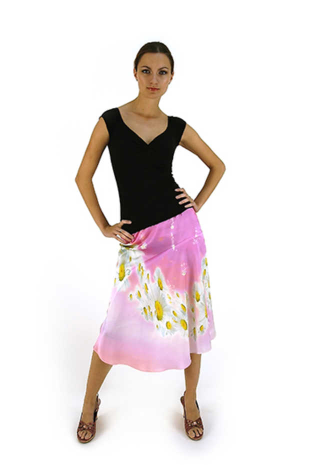 Flared skirt with asymmetrical bias insertion, left side zipper, no waist band, lined. Length about 27 1/2 in. Silk Charmeuse or in a combination of Charmeuse/Dupioni silk. As the wholesome and beautiful daisies dance around this skirt, they establish a playful and innocent ambiance that is sure to brighten any day. This romantic design is predicted to bring plenty of spring to your spirit.