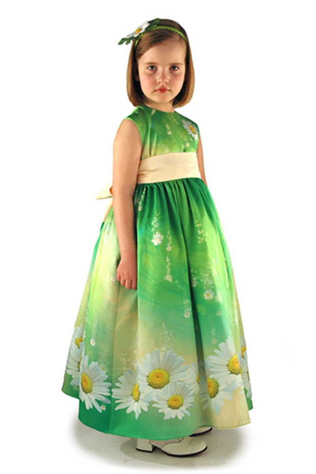 Sleeveless, silk Charmeuse, tea-length dress with jewel neckline, full gathered skirt with tulle crinoline and tie-back satin sash. Signature, original art by Digital CoutureĀ®, inspired by the innocence the daisy flower symbolizes. We take custom orders for different colors. Have your girl wear this dress for Flower Girl Dress, Princess Dress, and other Formal Events.
