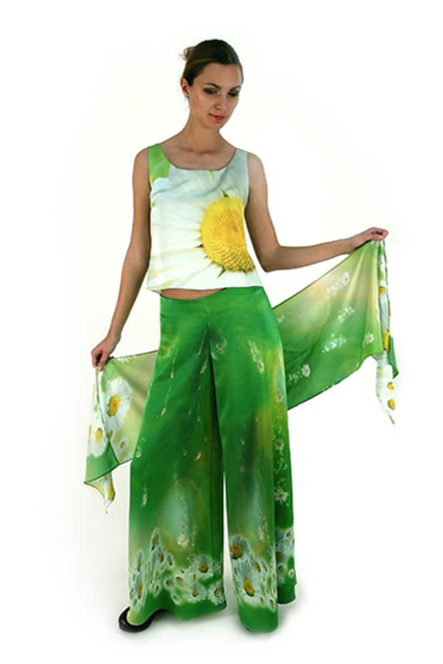Fluid Palazzo pants with wide, flowing legs, left side zip & elastic at waist. Outside leg approximately 38", hem approximately 40". Silk Charmeuse. With such a design it is so easy to fall into the innocence the daisy flower symbolizes. Try imagining yourself in a large field of daisies, picking one of the flowers, plucking the petals one by one, and finding everyone loves you.