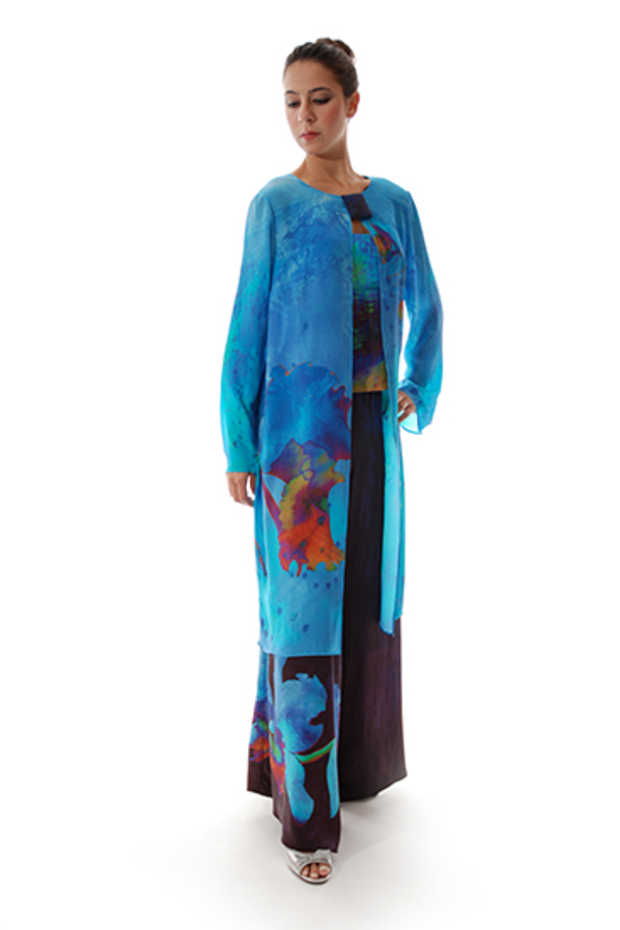 Experience the love and romance of a Mediterranean Night! This 3 pieces ensamble includes the "Mediterranean Night" Palazzo, the "Mediterranean Coral" Empire style shell and the "Mediterranean Orchid" Duster. Orchid has earned the reputation as flower of magnificence that brings a universal message of love, beauty and luxury.