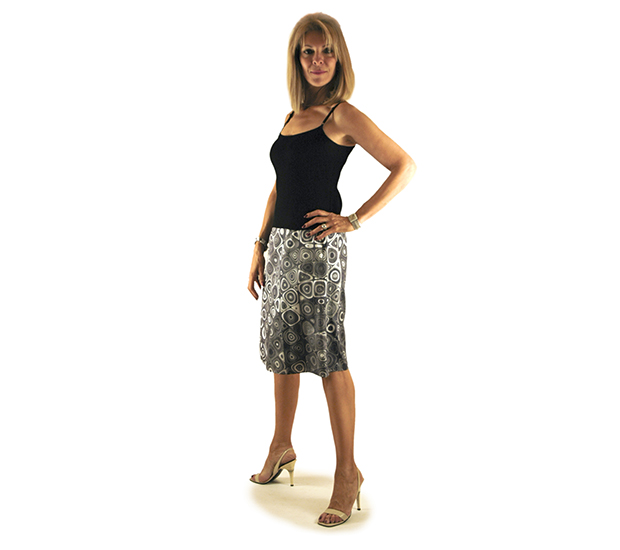 Slightly flared short skirt, left side zipper, no waist band, lined. Skirt length approximately 23". Silk Charmeuse. For a different print on this style, please contact us. The precise geometric patterns of Greek and Byzantine mosaics inspired the creations of this abstract design. Mosaic is a medium of art consisting of a design made of small pieces of colored stone, glass, small tiles or fragments of pottery.