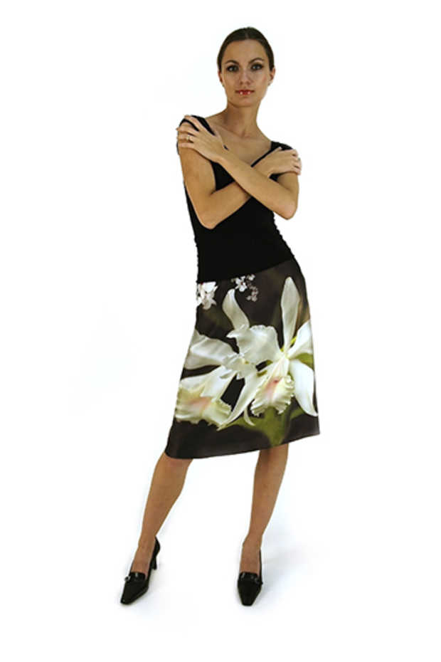 Slightly flared short skirt, left side zipper, no waist band, lined. Skirt length approximately 23". Silk Charmeuse. "Orchid has earned the reputation as flower of magnificence that brings a universal message of love, beauty and luxury. Its name comes from Orchis, the son of a nymph and a satyr. The legend says Orchis unrestrained attraction for womans beauty made Bacchus so angry he ordered to have him chopped in pieces and thrown all over the earth. Wherever a piece landed an orchid grew. Orchis now fulfills his desire of always embracing the womans body by becoming the avatar of these captivating palazzo pants. Wrapped in such an expression, you are bound to capture peoples eyes and hearts.