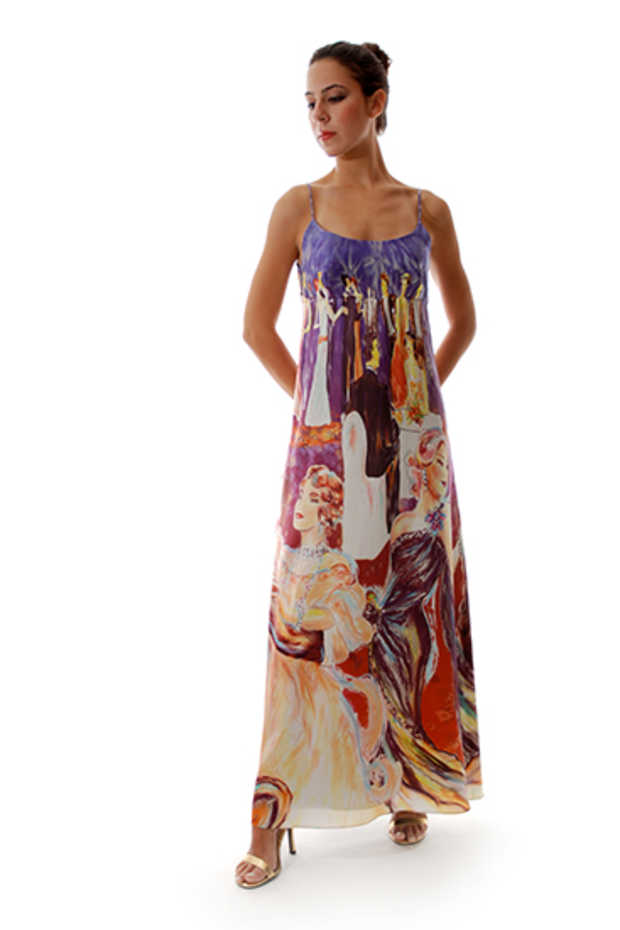 Sleek Empire line dress, spaghetti straps, cami neckline, back zipper, floor length, slightly flared hem, lined. Length from waist approximately 41". Silk Charmeuse. Signature, original art by Digital Couture®, seamlessly hand printed on silk. Inspired by and in homage to La Belle Époque, the golden age of style, this exceptional dress offers life from every angle. Taken from absolutely original, signed artwork, done in the vein of Dupre, and seamlessly transferred to silk Charmeuse, this tantalizing dress becomes a glamorous walking canvas itself. With such a stunningly unique gown you are guaranteed to be the life of the party.