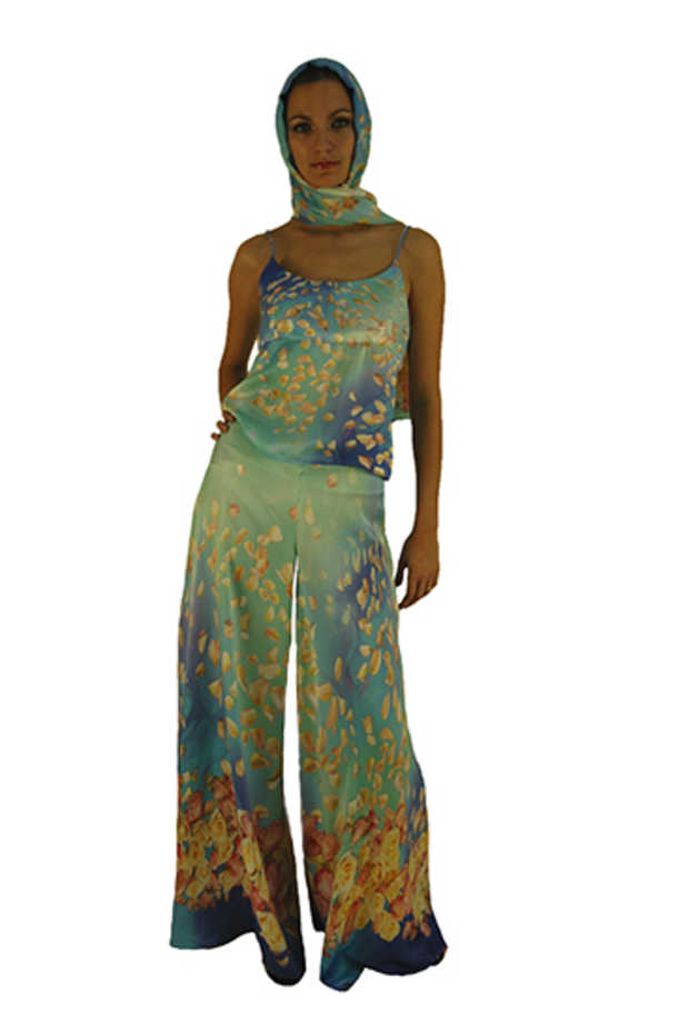 Fluid Palazzo pants with wide, flowing legs, left side zip & elastic at waist. Outside leg approximately 38", hem approximately 40". Silk Charmeuse. Let the fragrance of the elegant rose, the flower of love, and the melody of the most celebrated love song of all times, "Plaisir d'Amour", transport you into a love aura. The falling rose petals will bring sophistication, luxury, and romance to your special occasion.