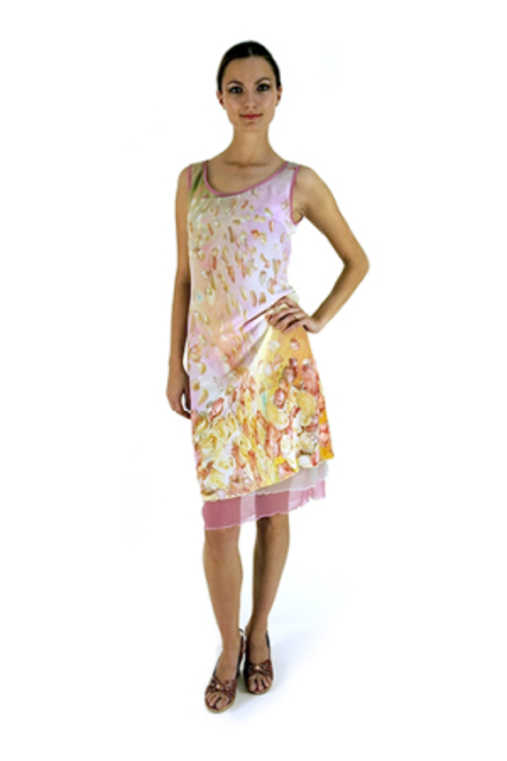 Sleeveless short dress, round scoop neckline, lined. Length from waist about 24 in. Signature, original art by Digital Couture®, inspired by the elegant rose, the flower of love, and by the melody of the most celebrated love song of all times, Plaisir d'amour. The falling rose petals will bring sophistication, luxury, and romance to your special occasion. We take custom orders for different colors. Fabric: Crepe de Chine, Charmeuse or Four Ply silk.