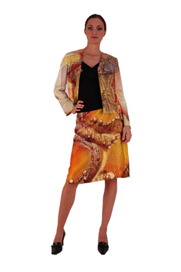 Slightly flared short skirt, left side zipper, no waist band, lined. Skirt length approximately 23". Silk Charmeuse. This boldly creative design adds exquisiteness to an abstract pallet of colors that blend throughout the skirt. Through the irresistible hues and blends, strokes of pearly color tempt the figure with a stream of romance. This piece offers a sense of spontaneity and joyfulness in the journey of life. In this skirt you will feel free to be defiantly original in beauty as a true Promethean Goddess.