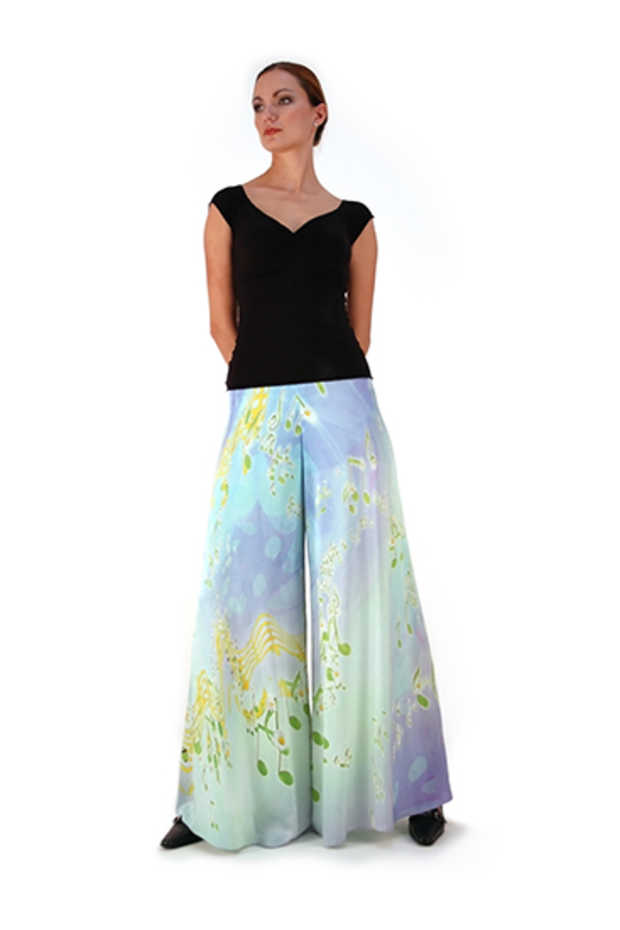 Fluid Palazzo pants with wide, flowing legs, left side zip & elastic at waist. Outside leg approximately 38″, hem approximately 40″. Silk Charmeuse. Under this artistic graphic, discover a fragment of the oldest and most celebrated romance of all times, "Plaisir d'Amour". This love song was written by Florian and composed by Martini for the French court, in 1785, and have charmed the love ones since. Now its your turn to charm!