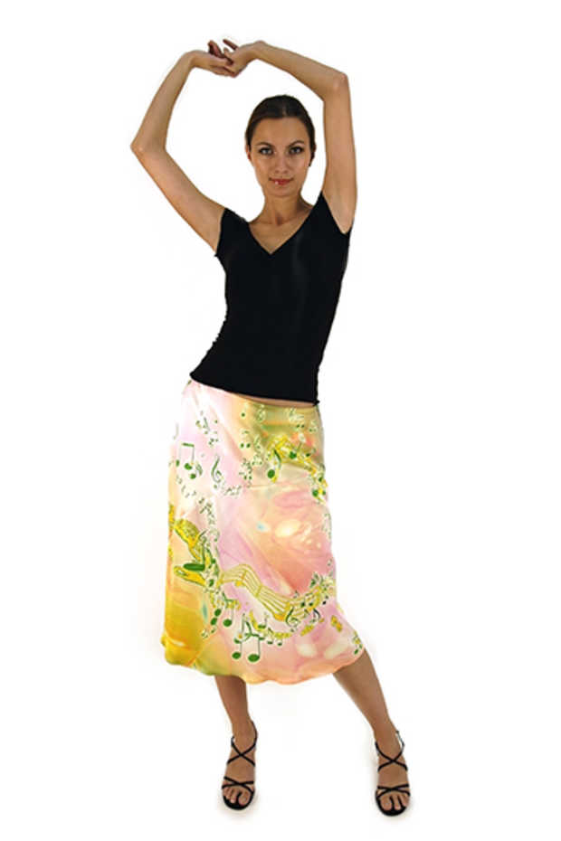 Flared skirt with asymmetrical bias insertion, left side zipper, no waist band, lined. Length about 27 1/2 in. Silk Charmeuse or in a combination of Charmeuse/Dupioni silk. Under this artistic graphic, discover a fragment of the oldest and most celebrated romance of all times, "Plaisir d'Amour". This love song was written by Florian and composed by Martini for the French court, in 1785, and has charmed the love ones since. Now its your turn to charm!